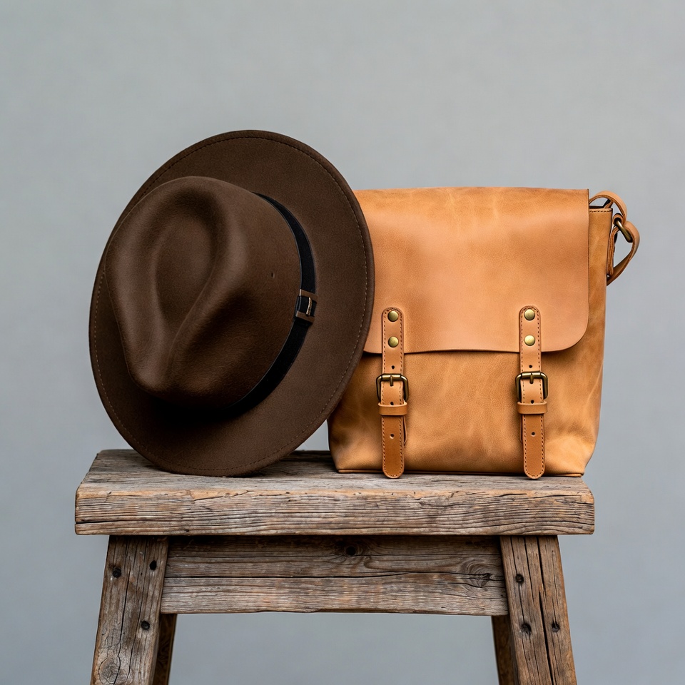 A brown wool fedora hat with a black band sits next to a tan leather messenger bag on a wooden stool. The hat features a soft felt texture and curved brim, while the bag has brass buckles and a shoulder strap. Both accessories are arranged against a plain gray background.