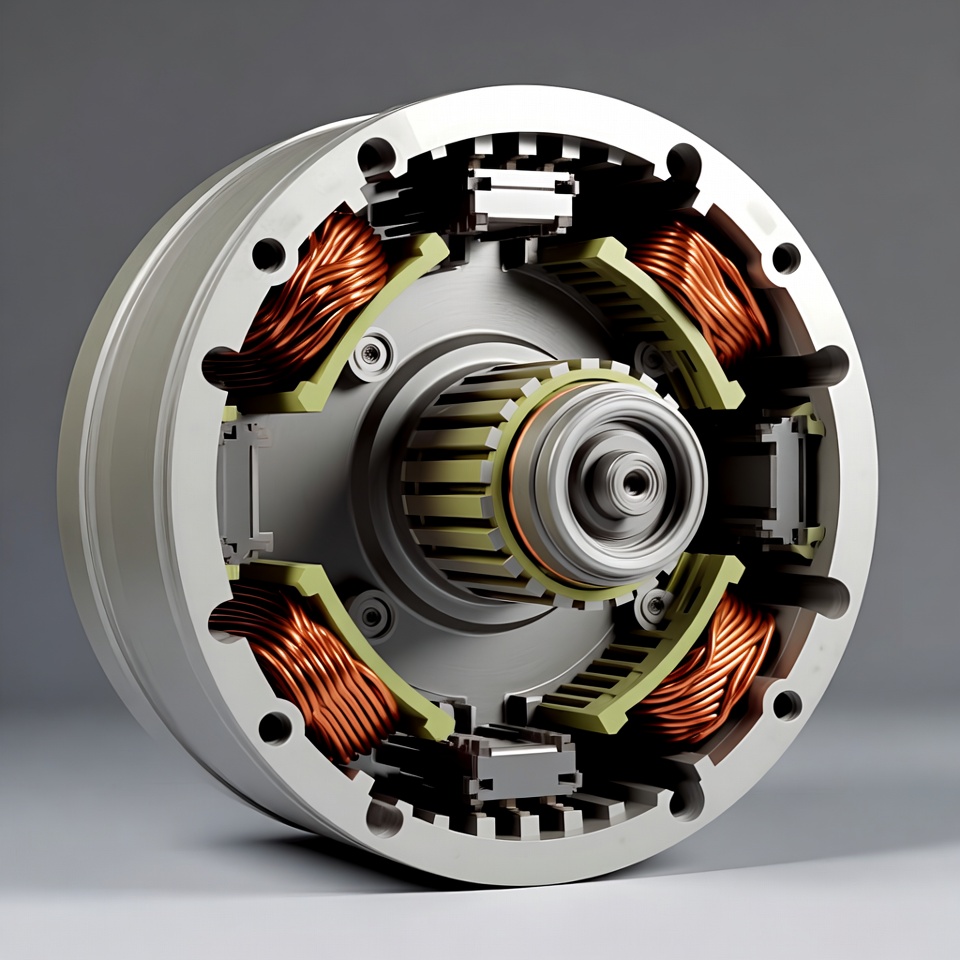 3D render, automotive, coils, copper windings, cross section, cutaway, engineering, illustration, isolated background, machine, mechanical parts, motor internals, rotor, silver housing, stator, electric motor