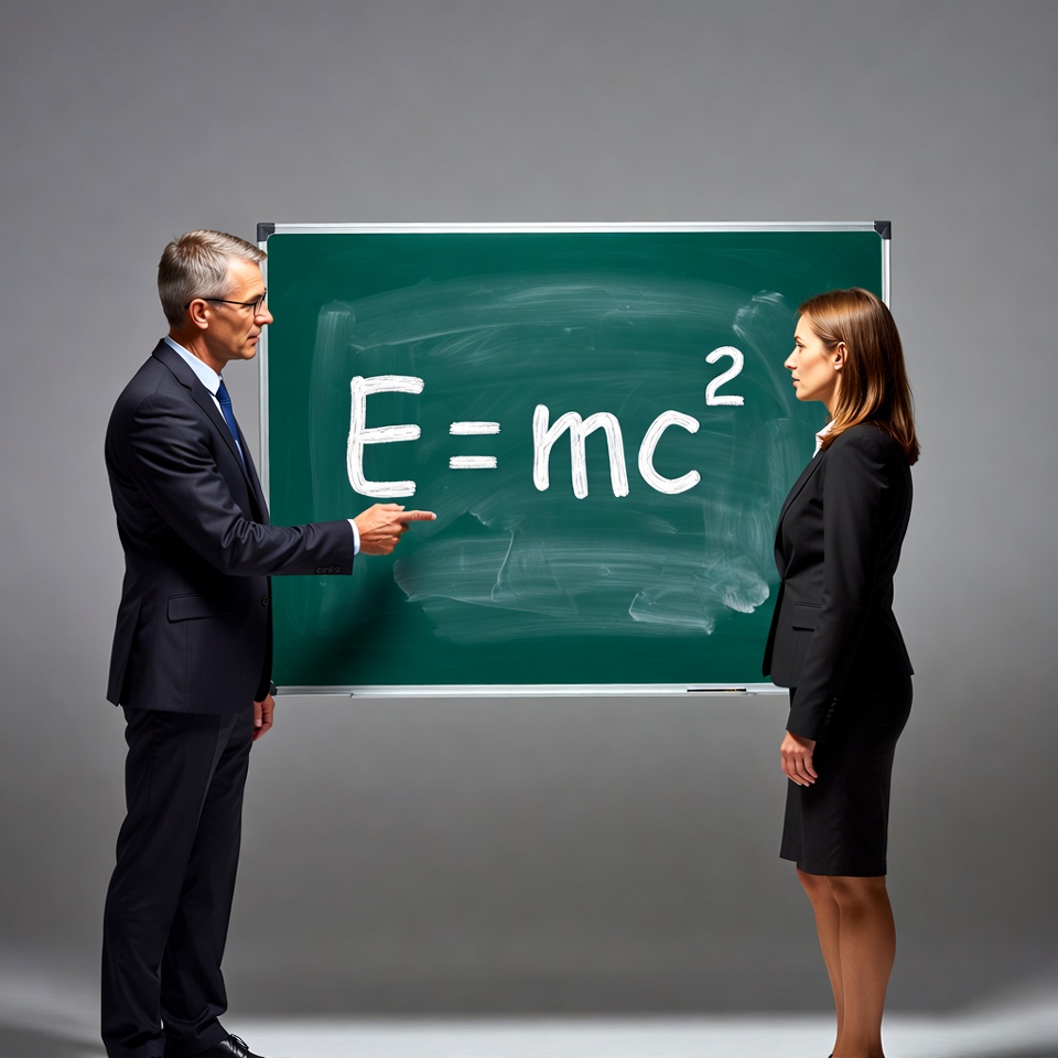 E=mc², White, business attire, chalkboard, classroom, education, equation, female, formula, gray background, green board, indoor, male, man, physics, pointing, professional, science, standing, suit, white chalk, woman, teacher