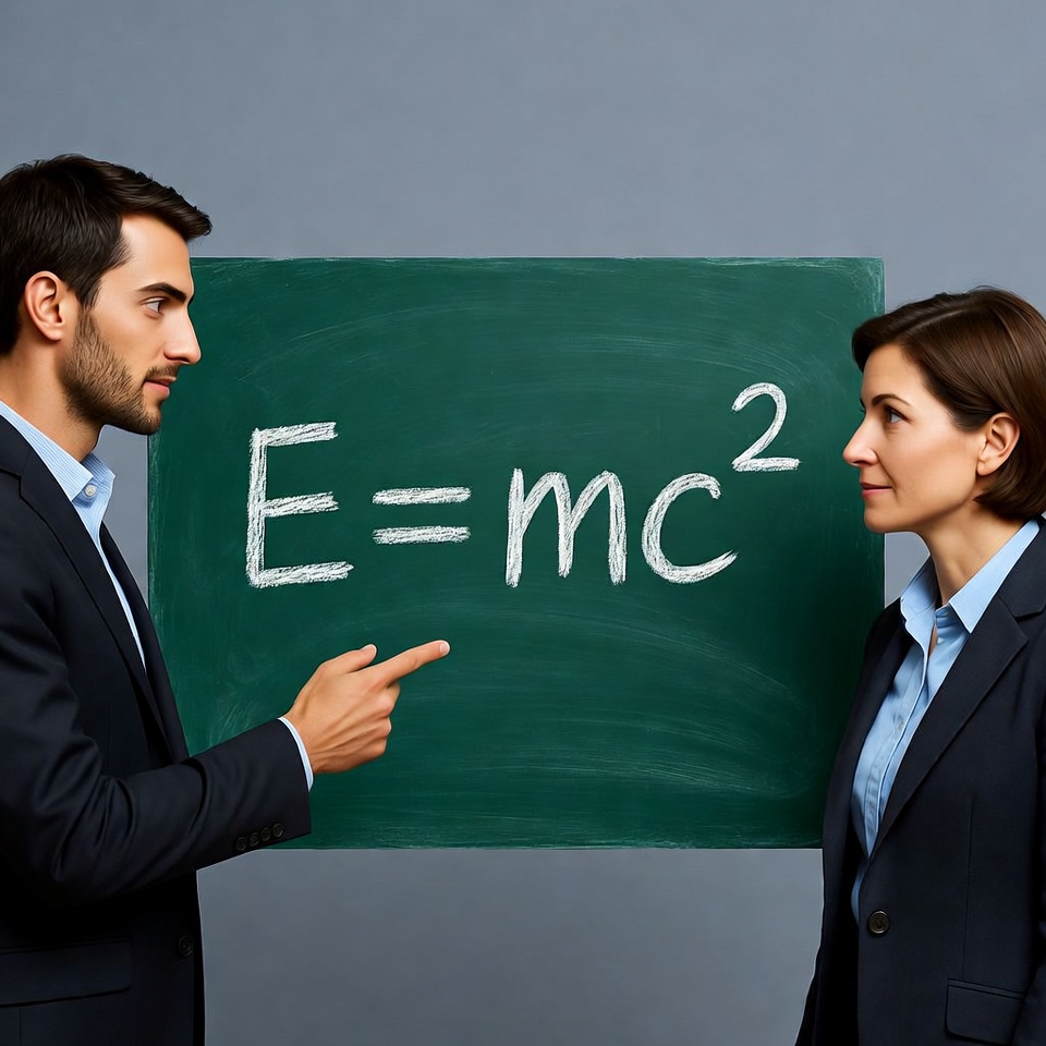 E=mc², Einstein equation, White, blackboard, business attire, chalkboard, classroom, discussing formula, education, female, green board, male, physics, pointing, professor, relativity, science, suit, teacher, white chalk, woman, man