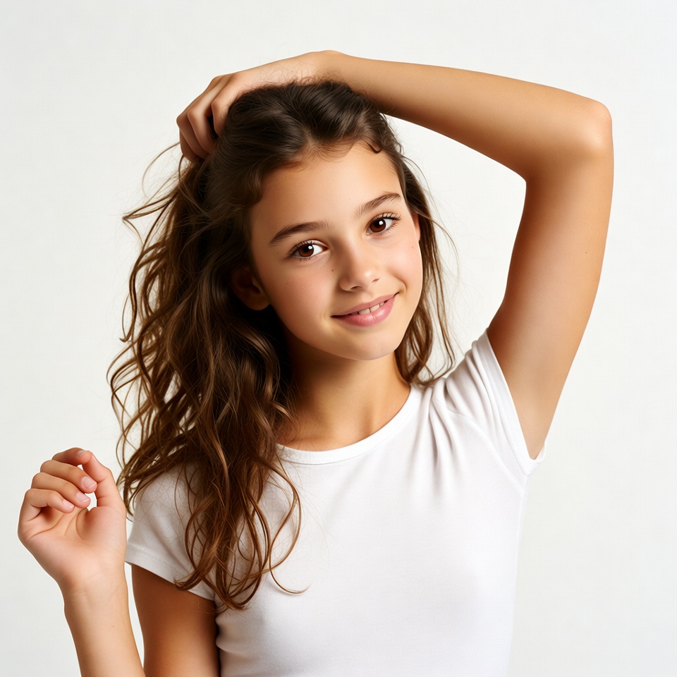 A young girl with long wavy brown hair smiles at the camera while running one hand through her hair. She wears a simple white t-shirt and stands against a plain white background. Her other hand is relaxed by her side, and she has a friendly expression with visible dimples.