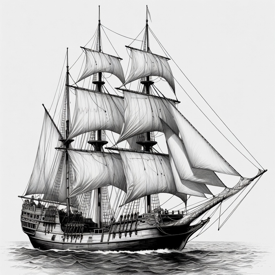 A detailed black and white illustration of a classic sailing ship with multiple masts and billowing white sails. The wooden vessel glides over calm ocean waves, viewed from the side. Fine line art captures the rigging, hull, and deck details.