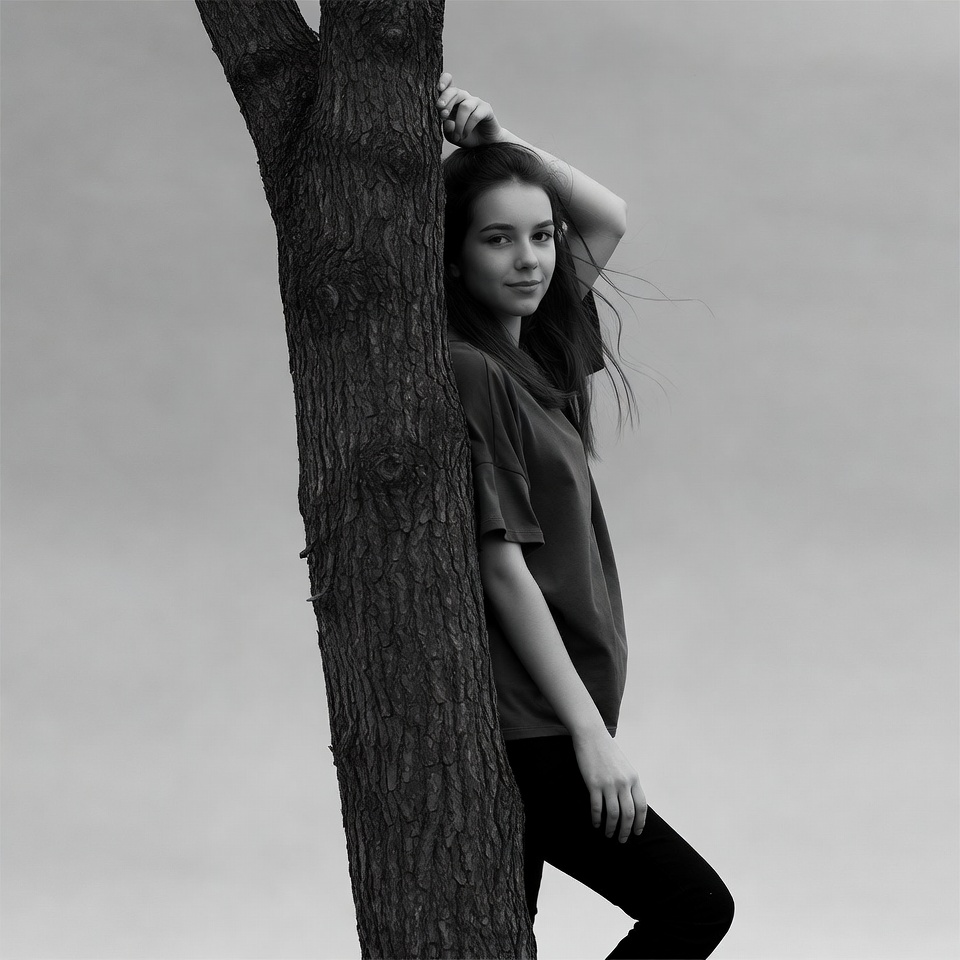 White, bark, black and white, casual pose, girl, hand on head, leaning tree, long hair, monochrome, nature, outdoor, pants, portrait, relaxed, side view, smiling, t-shirt, tree trunk, wavy hair, young woman, woman
