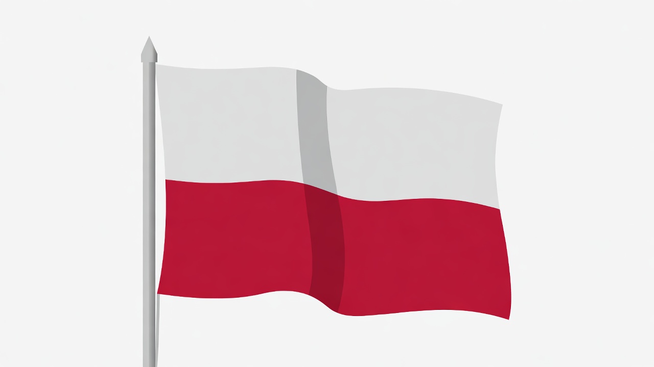 A simple illustration of the Polish flag waving on a flagpole. The flag features two equal horizontal stripes, white on top and red on the bottom. It is depicted against a plain white background.