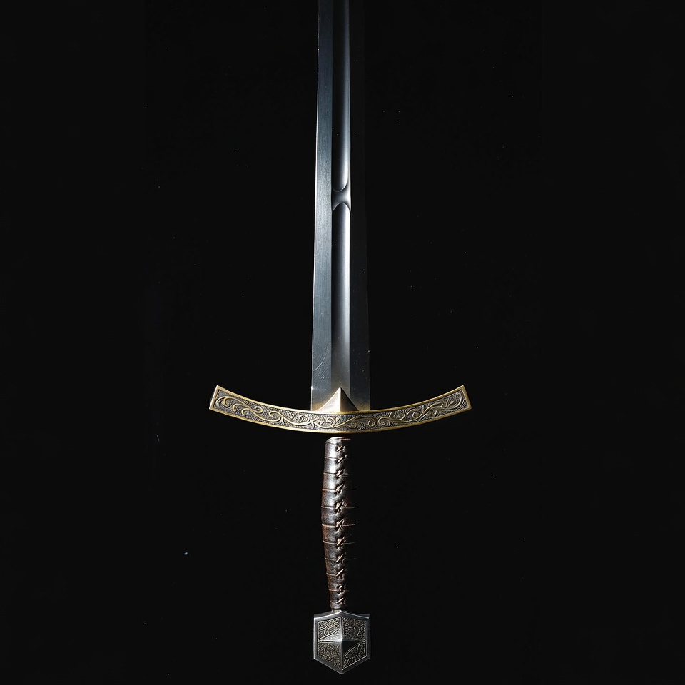 A detailed medieval longsword with a straight double-edged blade is displayed vertically against a black background. The crossguard features ornate gold engravings, and the grip is wrapped in brown leather. A small metal shield emblem adorns the pommel at the bottom.
