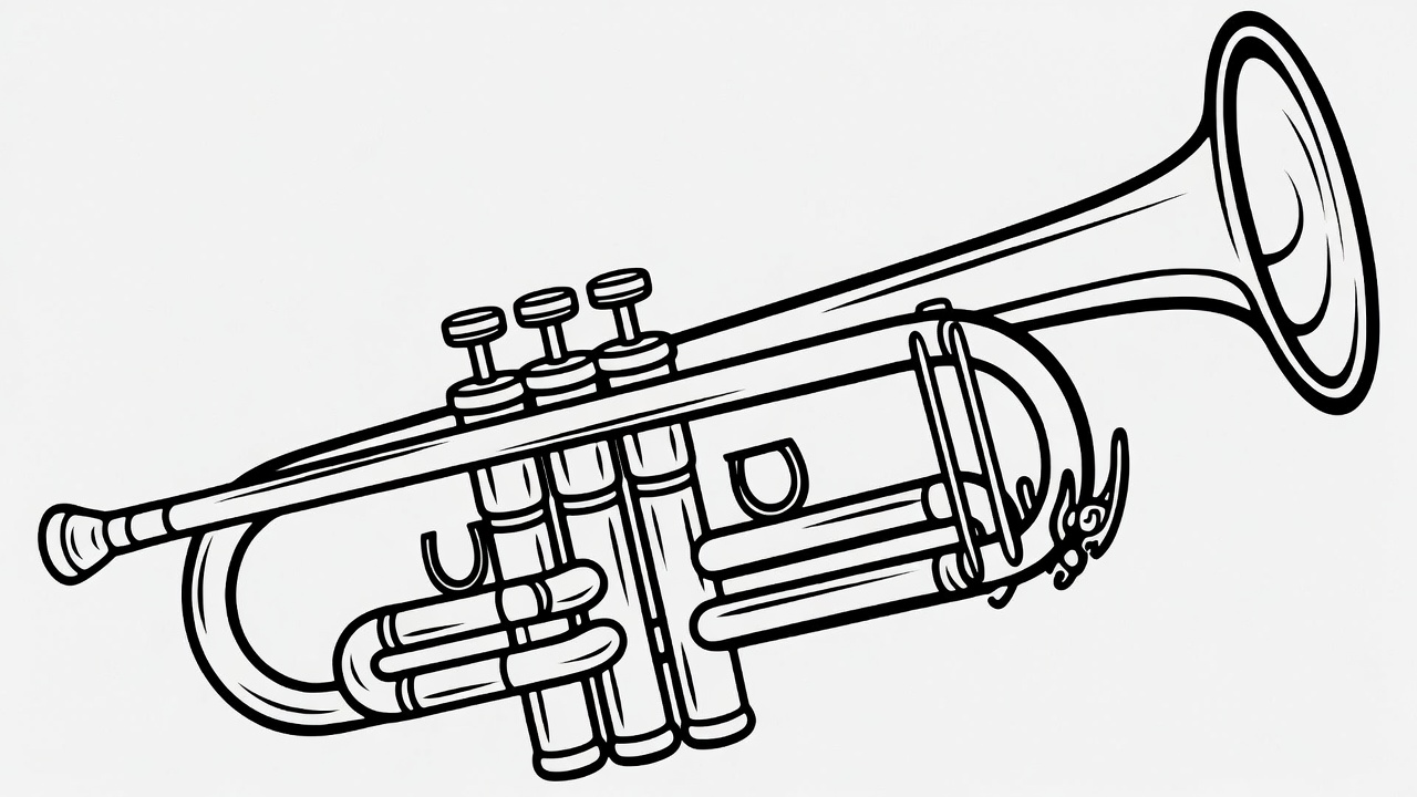 band instrument, bell, black and white, brass instrument, clipart, illustration, isolated background, jazz trumpet, line art, music, musical instrument, outline drawing, tubing, valves, vector graphic, trumpet