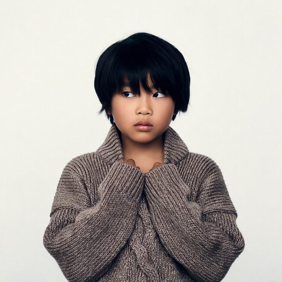 A young Asian boy with straight black hair stands against a plain white background. He wears a cozy gray cable-knit sweater with hands clasped at the collar. His expression is neutral with wide eyes looking forward.