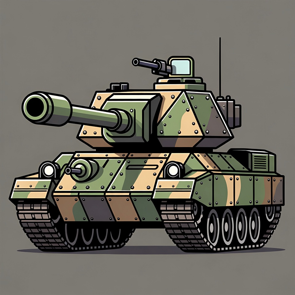 A detailed cartoon illustration of a military tank with camouflage green and brown patterns. The tank features a large barrel gun, turret, tracks, and antennas on an isolated gray background. It is depicted in a side-front view with bold outlines and shaded details.