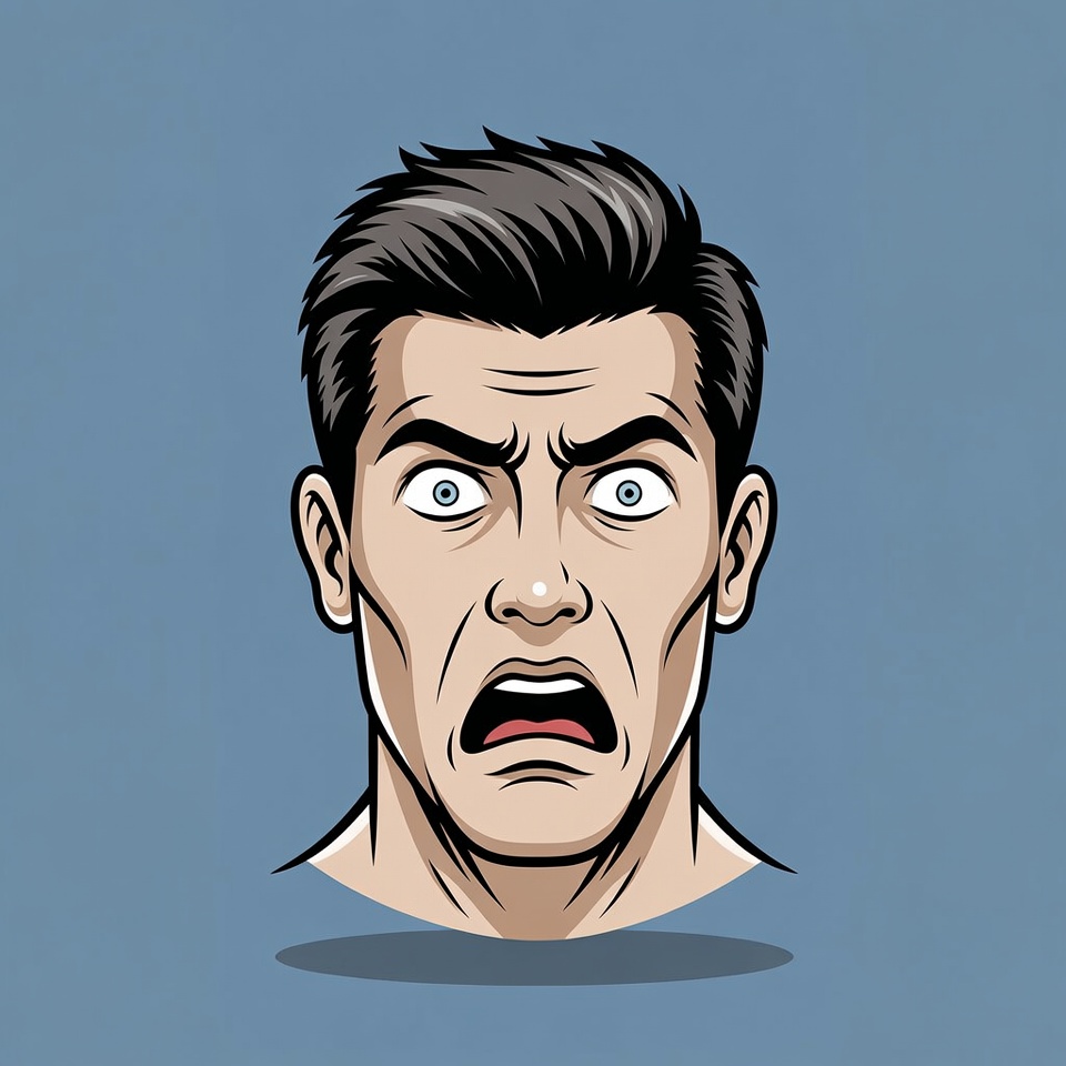 A cartoon illustration of a man's face with wide-open eyes and an open mouth showing shock. He has short dark hair and strong facial features outlined in a bold comic style. The face is centered on a solid blue background with a subtle drop shadow.
