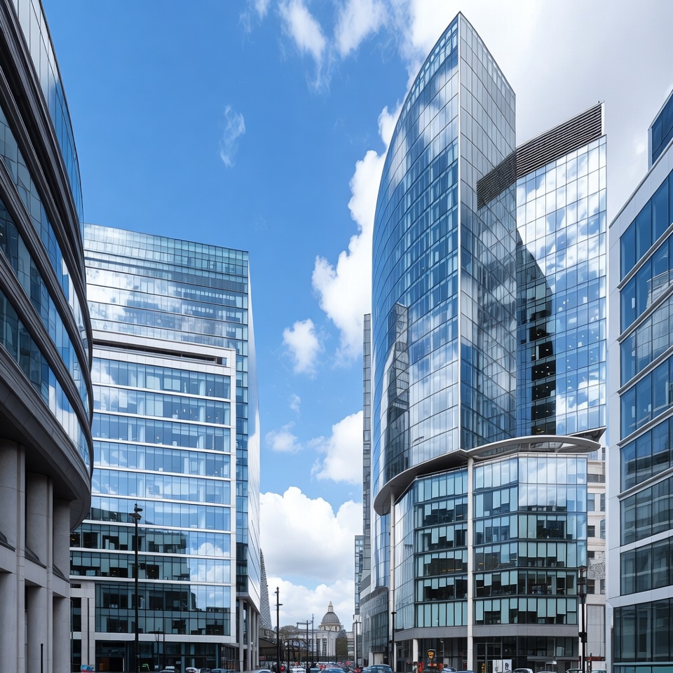 angular buildings, blue sky, cars, city skyline, city street, contemporary design, curved towers, dome building, glass facades, high-rise, modern buildings, reflective glass, urban architecture, white clouds, skyscrapers