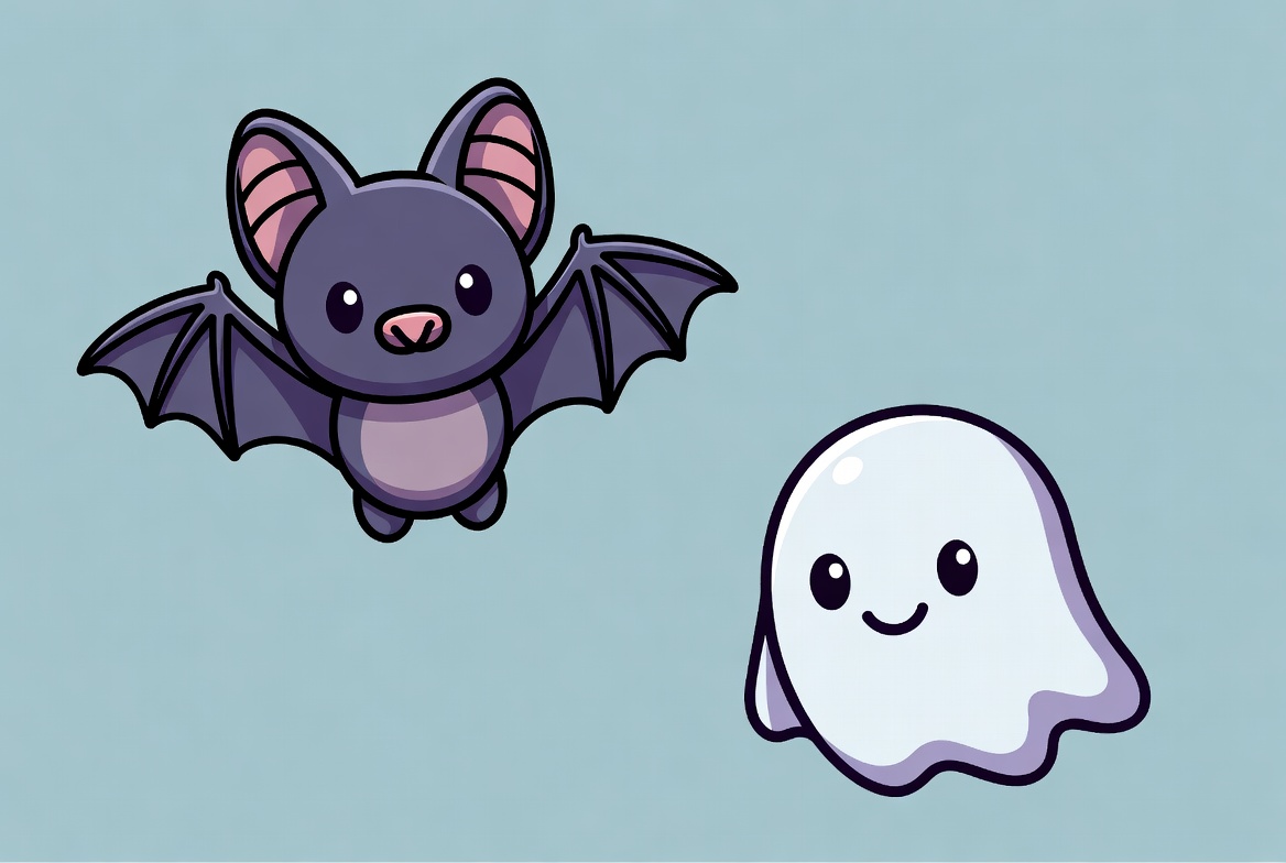 Halloween, adorable characters, bat, big eyes, cartoon, chibi bat, chibi ghost, clipart, flying bat, fun Halloween, ghost, illustration, isolated background, kawaii, light blue background, purple bat, smiling ghost, spooky cute, white ghost, cute bat