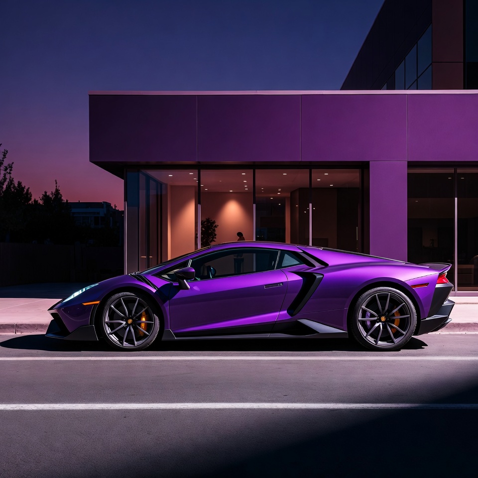 A sleek purple Lamborghini Aventador supercar is parked on a street at dusk next to a modern purple building with glass windows. The car features aggressive angular lines, large wheels with gold calipers, and glowing headlights. Warm interior lights illuminate the building entrance in the background.