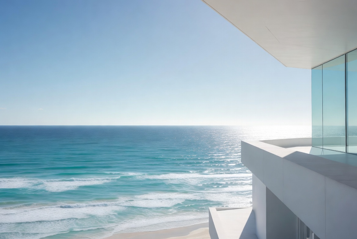 A modern white building with large glass windows and balcony overlooks a vibrant turquoise ocean under a clear blue sky. Waves crash on the sandy beach below, with sunlight reflecting off the water. The architecture features clean lines and a cantilevered design.