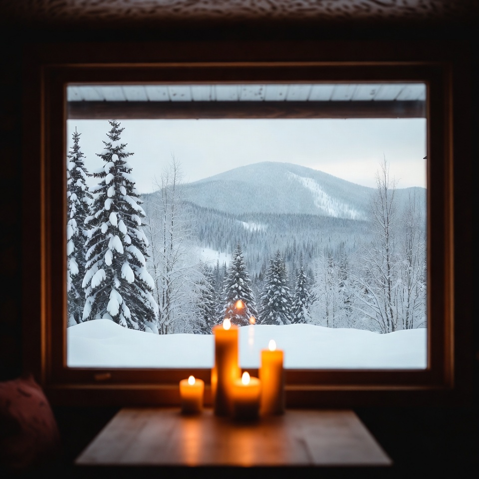 A window frames a snowy landscape with snow-covered pine trees and distant mountains under a cloudy sky. Several lit candles sit on a wooden table in the cozy foreground. Warm candlelight contrasts with the cold winter scene outside.