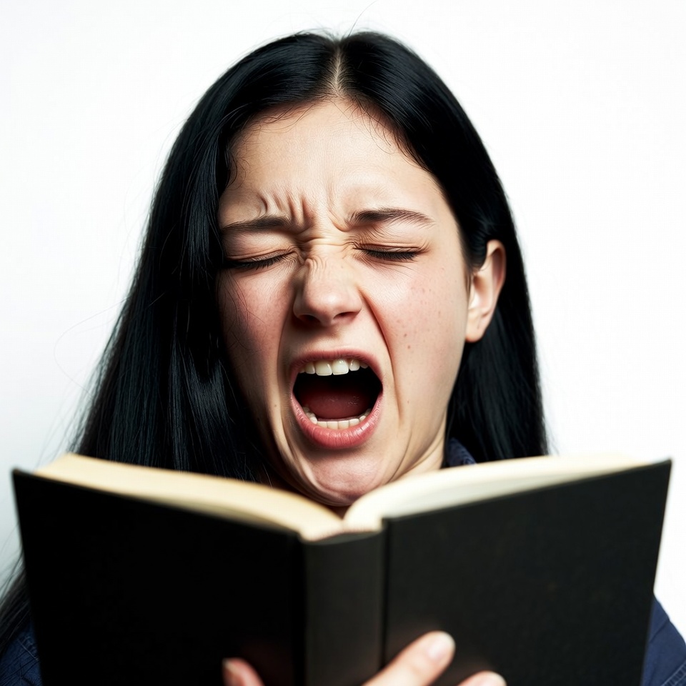 Asian, black book, black hair, book, distorted face, female, hands, holding book, intense expression, isolated background, long hair, open book, open mouth, reading book, screaming, white background, wide eyes, yelling, girl