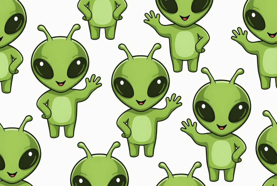 A seamless pattern features multiple cute cartoon green aliens with large black eyes and antennae. They are waving happily on a white background. The illustration is vibrant and playful, perfect for digital designs.