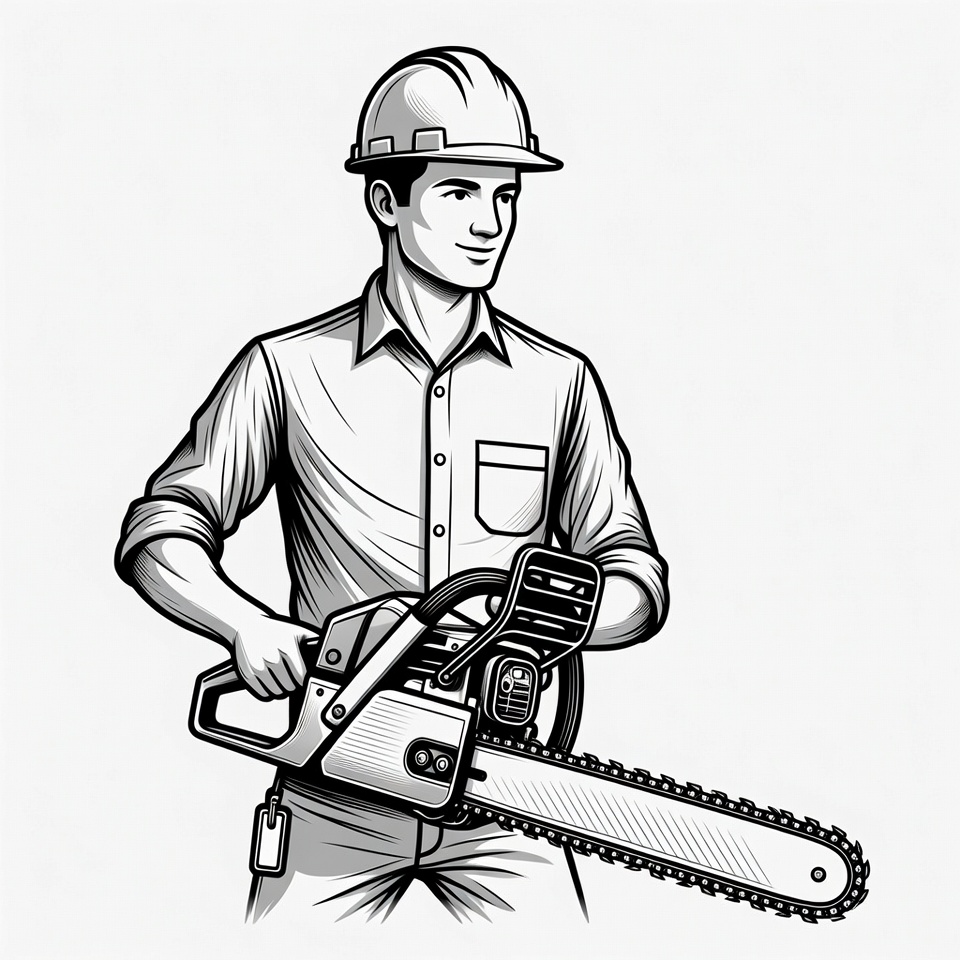 A line art illustration depicts a smiling man in a white shirt, pants, and hardhat holding a large chainsaw with both hands. He stands confidently on a plain background with his arms crossed over the tool. Detailed black and white sketch emphasizes the chainsaw blade and safety helmet.