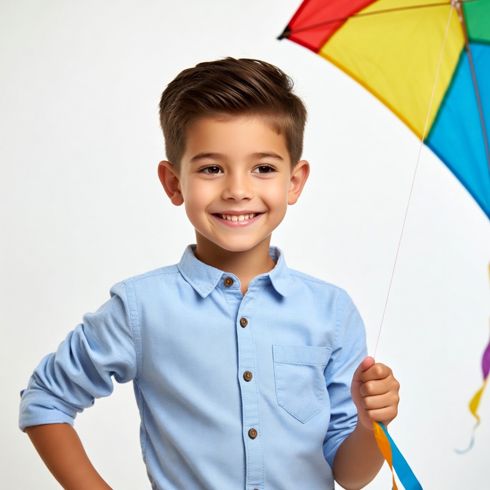 blue shirt, brown hair, button shirt, child portrait, colorful kite, happy child, holding kite, isolated background, kid with kite, male, rainbow kite, short hair, smiling boy, vibrant colors, white background, young boy, boy