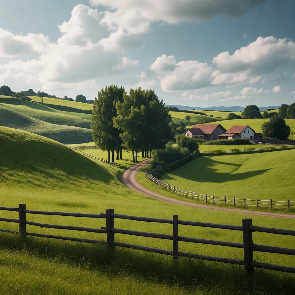 Vibrant green rolling hills stretch across a picturesque landscape under a partly cloudy sky. Red-roofed farmhouses sit nestled among clusters of tall trees, with a winding dirt road curving through wooden fences. Sunlight casts soft shadows over the lush grasslands.