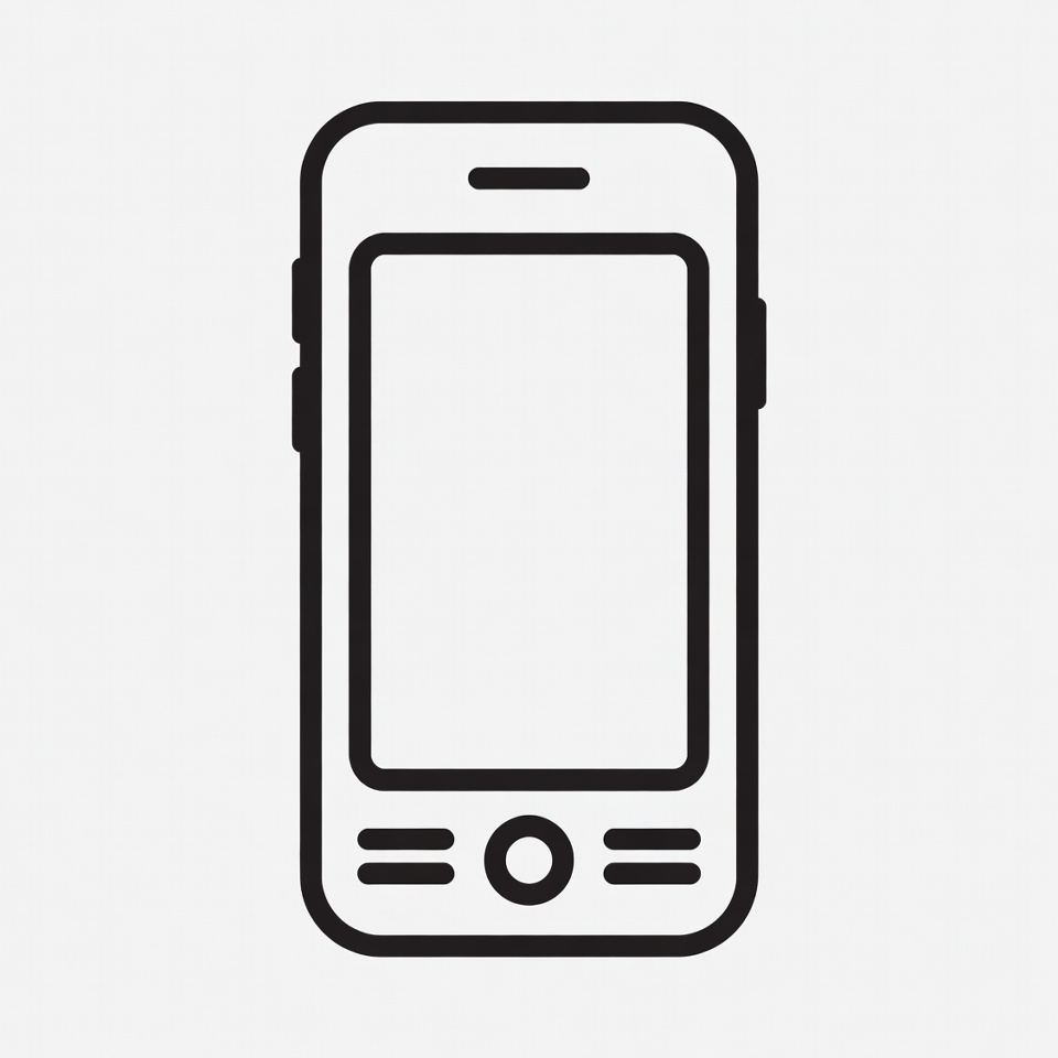 A simple black line art illustration of a smartphone with a blank screen. The phone features rounded corners, side buttons, and a bottom speaker. It is depicted on a white isolated background.