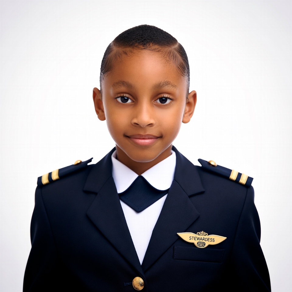 A young Black boy with short hair smiles at the camera while wearing a navy blue steward uniform. The uniform features gold epaulets on the shoulders, a white collar, black bow tie, and a stewardess badge with wings. He stands against a plain white background.