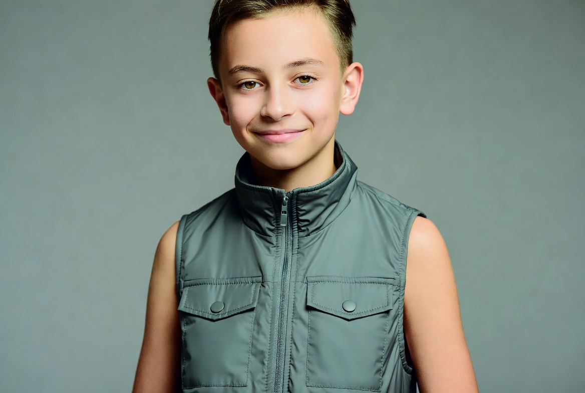 A young boy with short light brown hair stands smiling at the camera against a plain gray background. He wears a sleeveless gray vest with a high collar, zipper, and pockets. His expression is friendly and he faces forward directly.