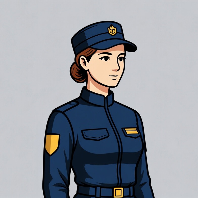 An anime-style illustration of a woman wearing a navy blue military uniform with gold insignia and epaulets. She has brown hair in a bun and wears a matching peaked cap with a gold emblem. She stands in a side profile view against a plain gray background.