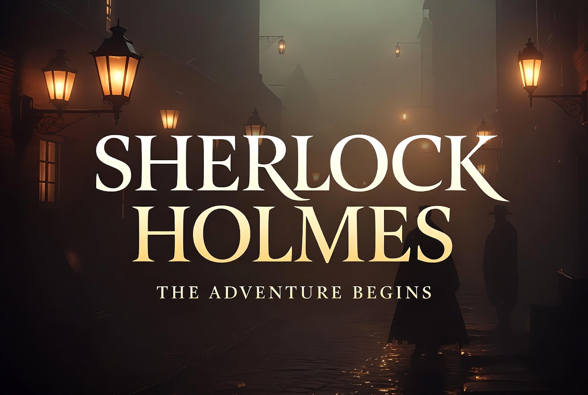 London street, adventure begins, brick buildings, coat, cobblestone, detective, fog, foggy street, gas lamps, golden text, illustration, lanterns, mist, mystery, night scene, shadowy figure, title screen, vintage, Sherlock Holmes