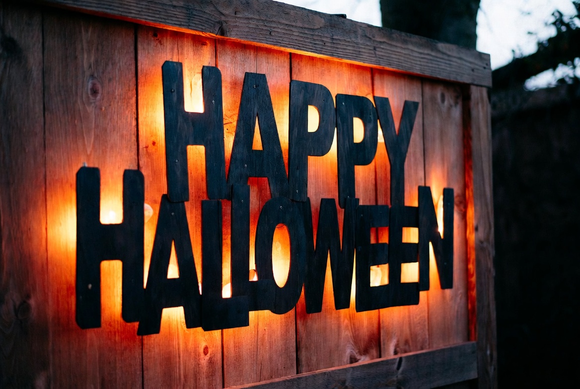 Halloween decoration, Halloween display, Halloween sign, black letters, festive sign, glowing letters, holiday sign, isolated background, lit sign, night sign, orange glow, rustic wood, spooky sign, wooden sign, Happy Halloween
