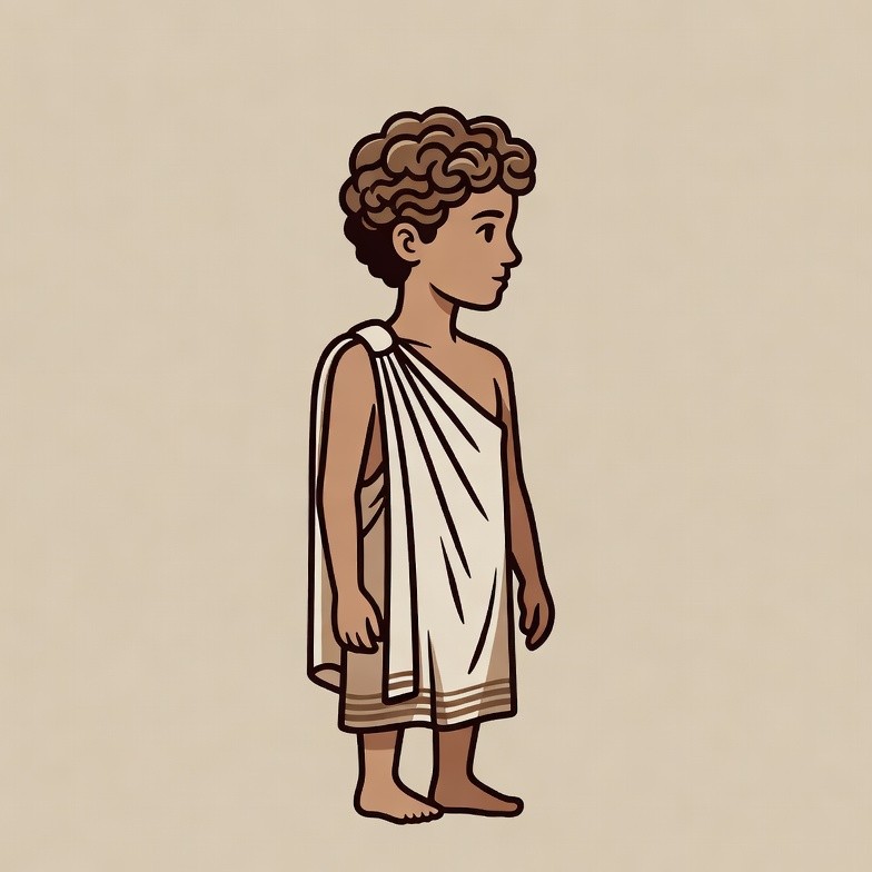 A cartoon boy with curly brown hair stands in profile wearing a white draped toga. He has bare feet and a simple expression on a beige background. The illustration features clean lines and a minimalist style.