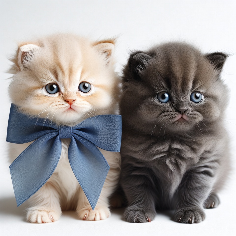 Two adorable kittens, one cream-colored and one gray, sit side by side on a white background. Each wears a large blue bow around its neck and gazes forward with big blue eyes. Their fluffy fur and tiny paws are prominently featured.