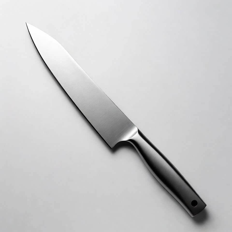 A sleek stainless steel chef's knife with a long, pointed blade and ergonomic handle lies angled on a plain white surface. The knife features a polished metal finish and a smooth gray handle. It is isolated against the white background for clear visibility.