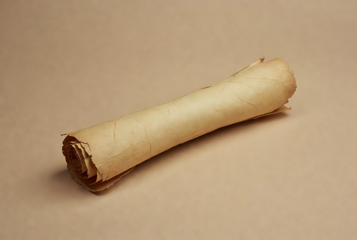 A tightly rolled scroll made of aged, beige parchment sits on a neutral tan background. The edges of the paper appear frayed and textured, giving it an antique appearance. It is positioned horizontally with subtle shadows enhancing its three-dimensional form.