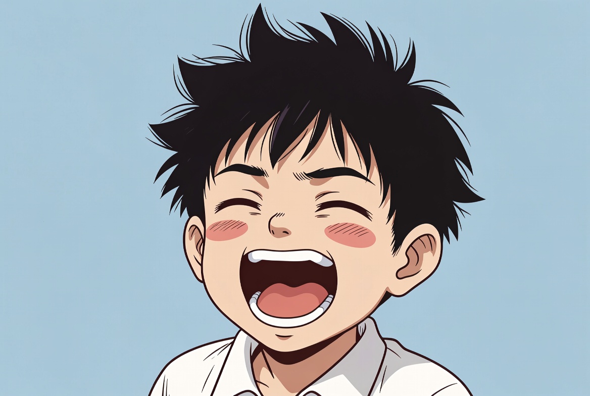 An anime-style illustration of a young boy with spiky black hair laughing joyfully on a blue background. He wears a white collared shirt and has squinted eyes with blush marks on his cheeks. His mouth is wide open in a big smile.