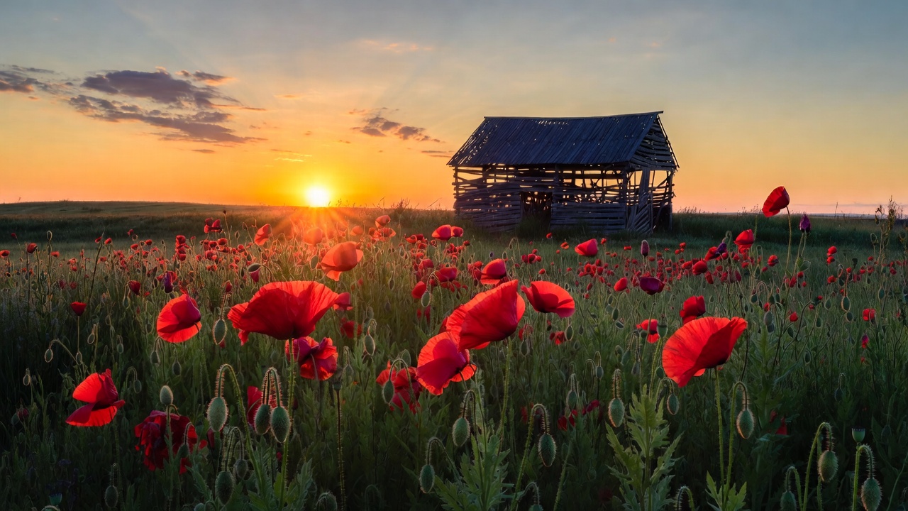A vast field of vibrant red poppies surrounds an old wooden barn during golden hour. The sun sets behind scattered clouds, casting a warm glow over the scene. The barn stands weathered with a sloped roof amid the blooming flowers.