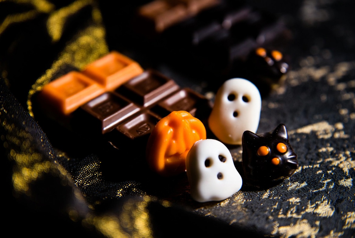 Halloween treats, black cat, candies, candy, cat candy, cats, chocolate, chocolate Halloween, chocolate bars, ghost candy, ghosts, isolated background, orange pumpkin, pumpkin candy, pumpkins, spooky, treats, white ghost, Halloween