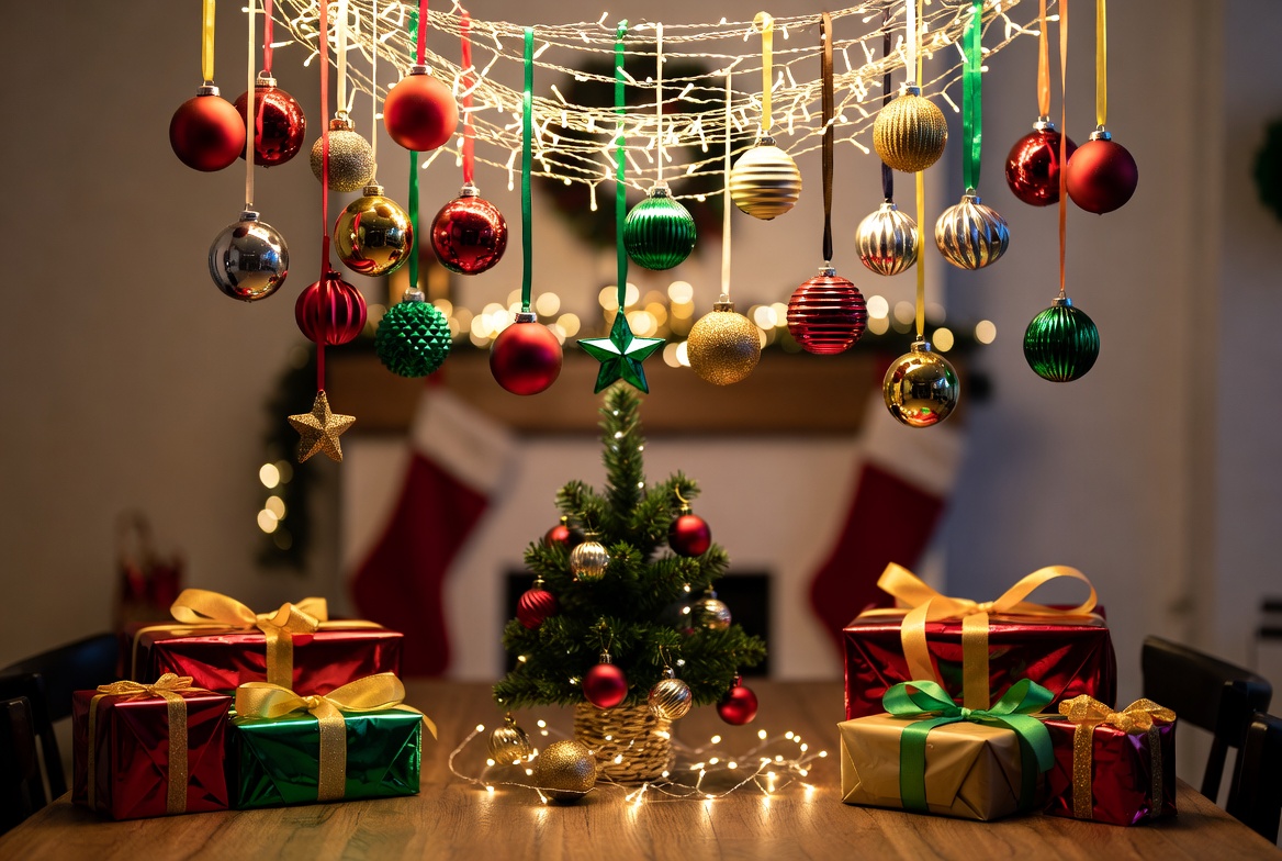 Colorful Christmas ornaments in red, green, gold, and silver hang from strings with fairy lights above a wooden table. A small decorated Christmas tree sits on the table surrounded by wrapped gift boxes in festive colors. A fireplace with stockings is visible in the blurred background.