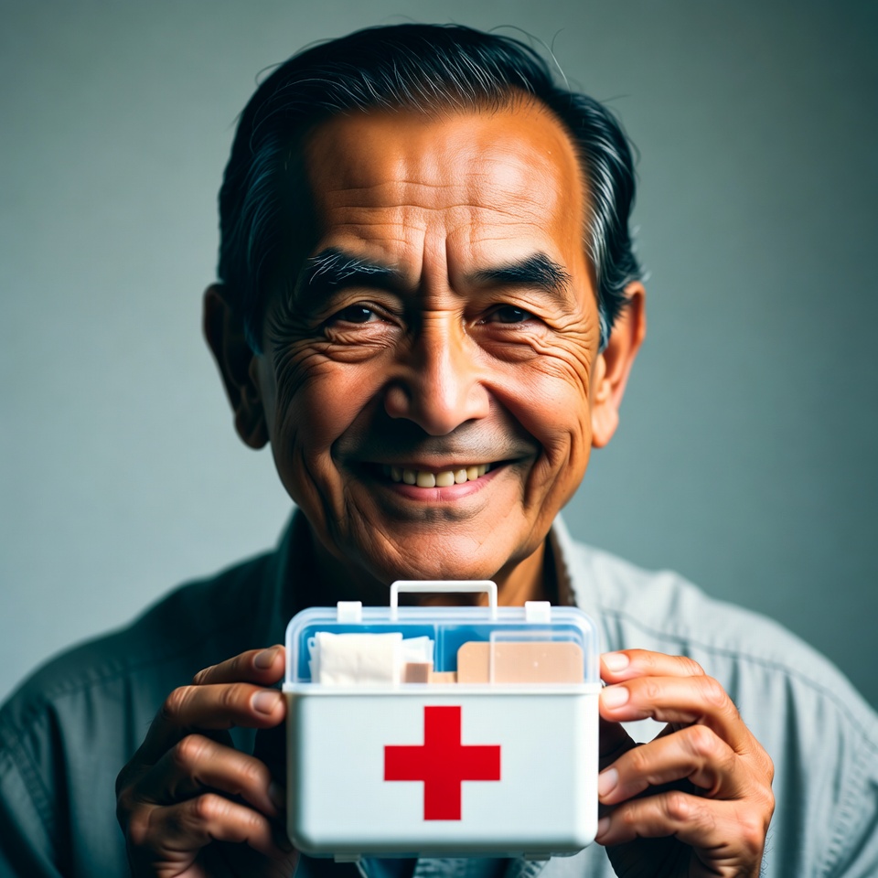 An elderly Asian man with short dark hair smiles while holding a white first aid kit with a red cross. He wears a light-colored collared shirt and stands against a plain gray background. The kit contains bandages and medical supplies visible inside.