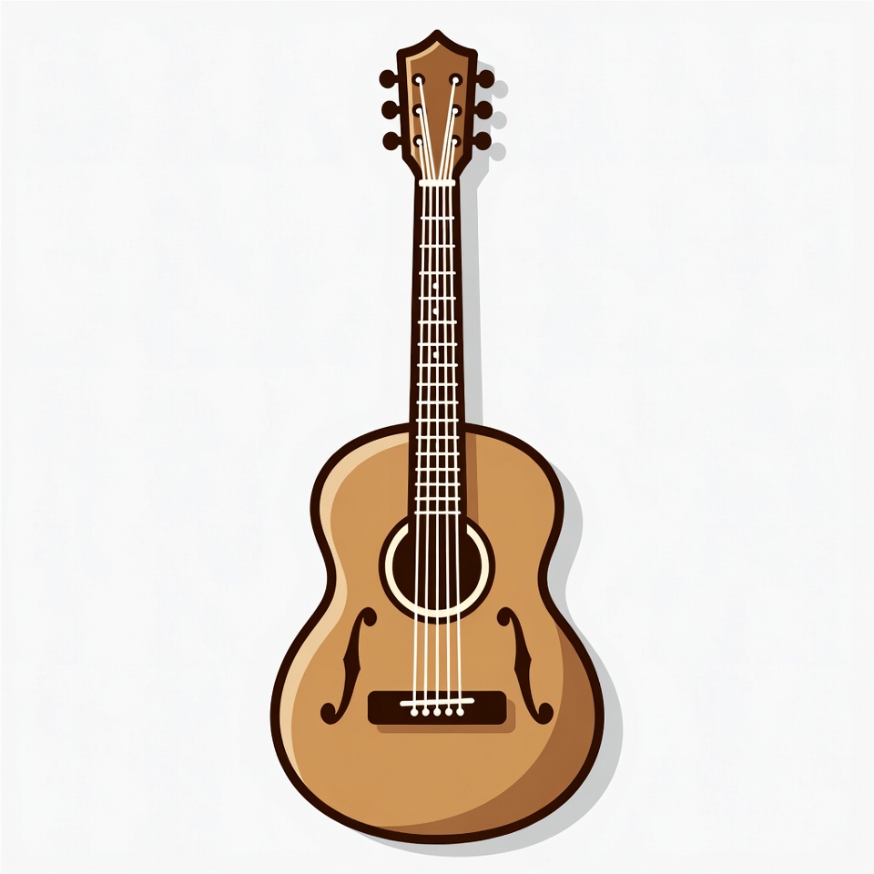 A cartoon-style brown acoustic guitar stands upright on a white background. It features a rounded body with f-holes, a long neck, and six tuning pegs. The illustration has smooth outlines and a subtle shadow for depth.
