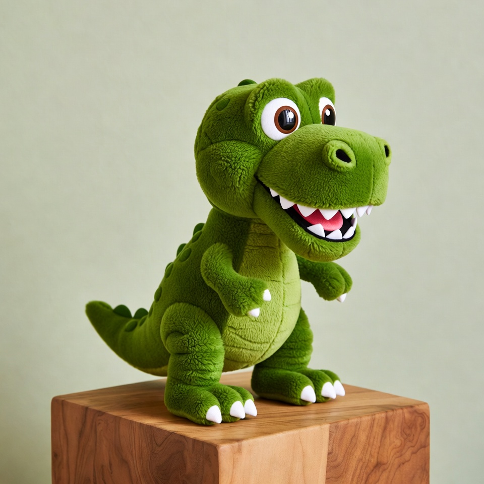 A plush toy dinosaur resembling a T-Rex stands on a wooden block against a light green background. The toy features vibrant green fur, big expressive eyes, sharp teeth, and tiny arms. It has a friendly, smiling expression with detailed scales and claws.