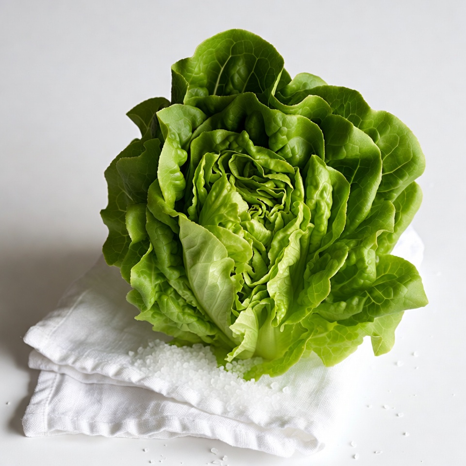 A head of fresh green romaine lettuce sits on a white cloth with scattered salt grains underneath. The lettuce features vibrant, crisp leaves forming a tight core. It is centered against a plain white background.