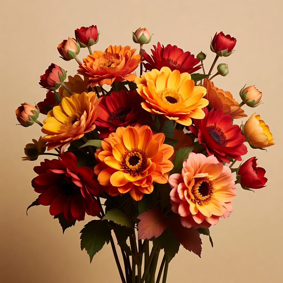 autumn flowers, beige background, daisy bouquet, floral bouquet, flower arrangement, flower stems, fresh flowers, green leaves, isolated background, multicolored flowers, orange flowers, red flowers, vibrant bouquet, yellow flowers, gerbera daisies