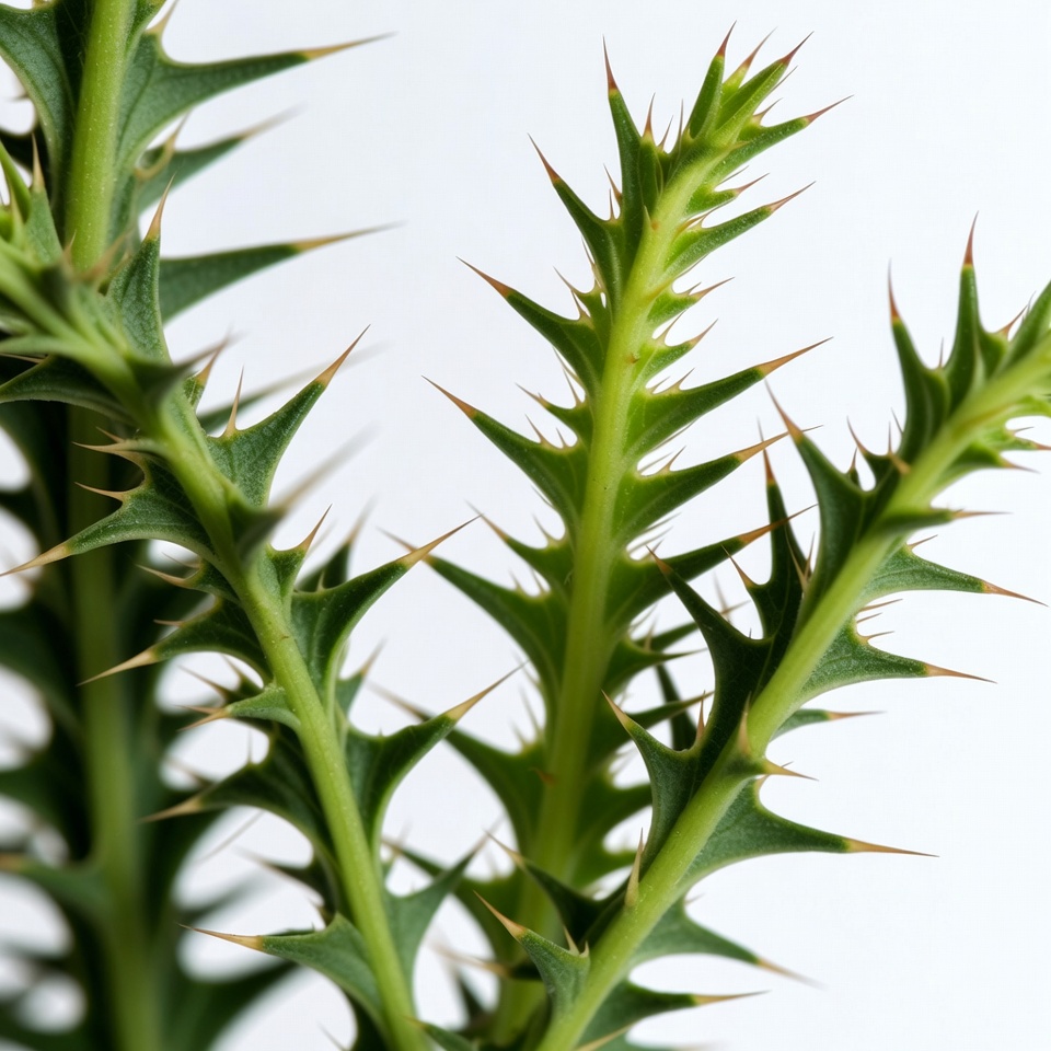 botanical, flora, green plant, isolated background, nature, plant closeup, prickly stems, sharp spines, spiky plant, spiny leaves, stem, thorns, thorny plant, white background, thistle