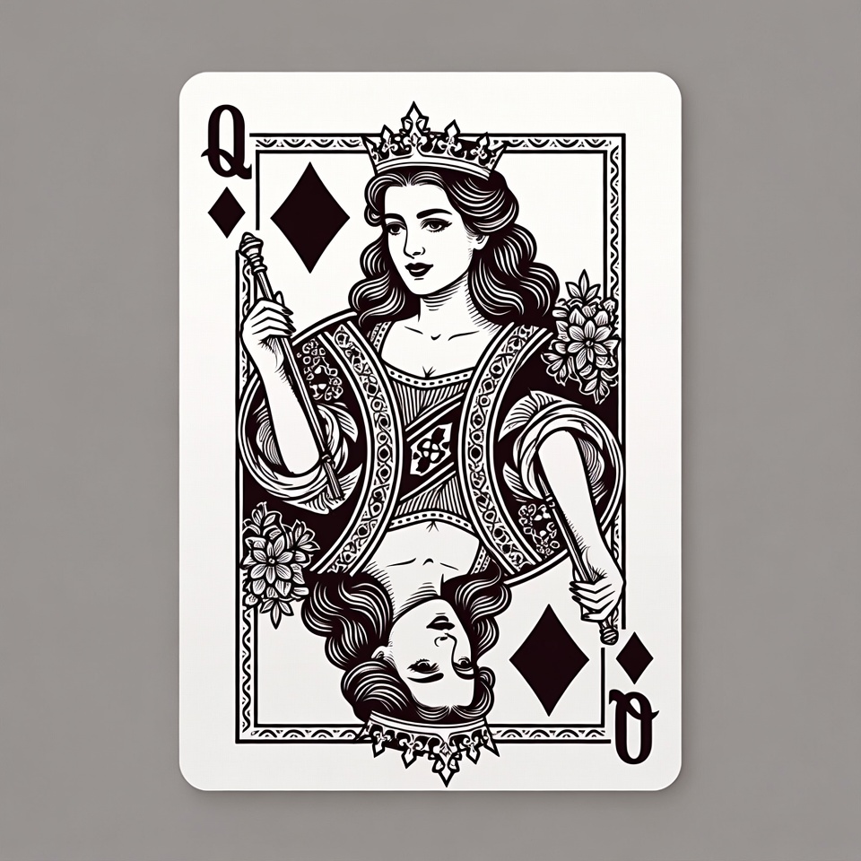 A detailed black and white illustration of the Queen of Diamonds playing card features a regal woman with long wavy hair and a crown. She wears an ornate gown with floral patterns and holds a scepter, depicted both upright and inverted on the card. The design includes diamond suit symbols and intricate decorative borders on a white background.