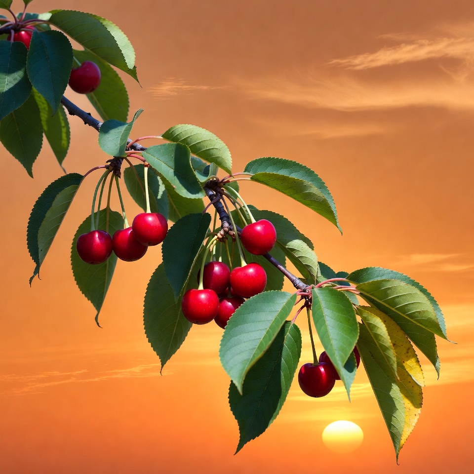 Ripe Cherries on Branch at Sunset