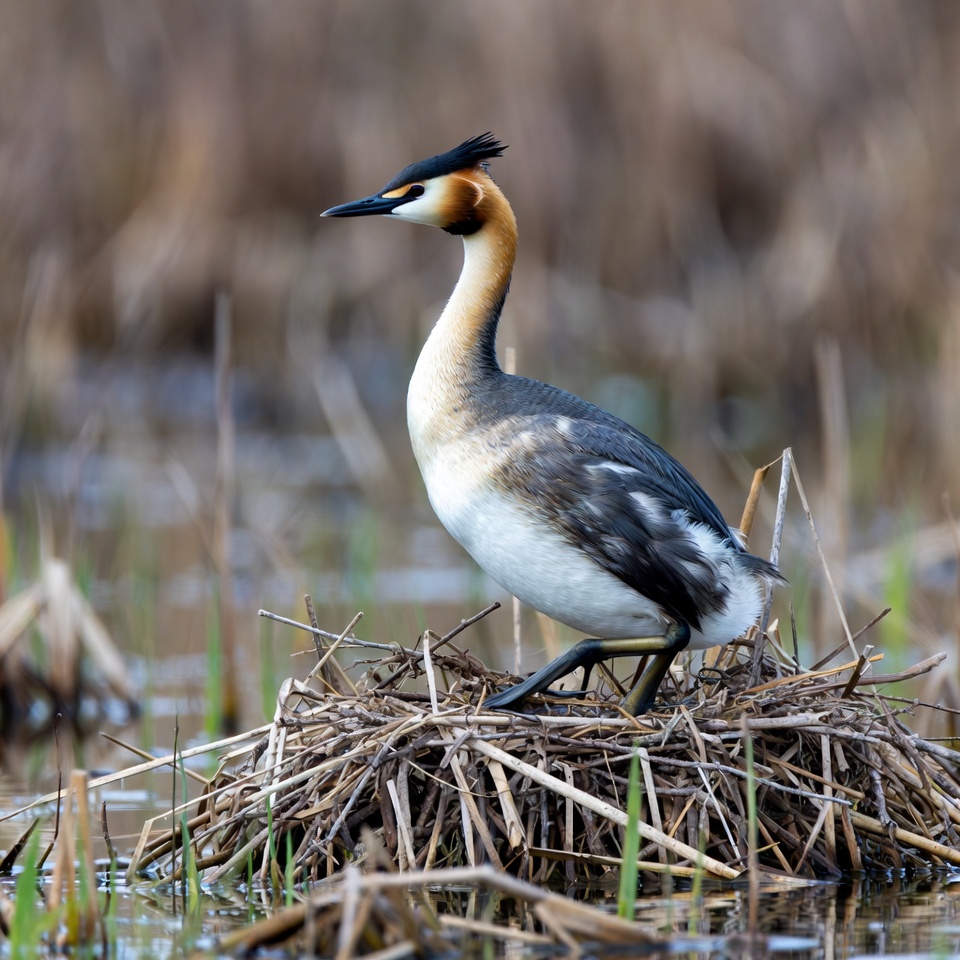 avian, bird, black crest, crest, feathers, golden head, grebe, nature, nest, reeds, shallow water, water, water bird, waterfowl, wetland, white neck, wildlife, yellow legs, great crested grebe