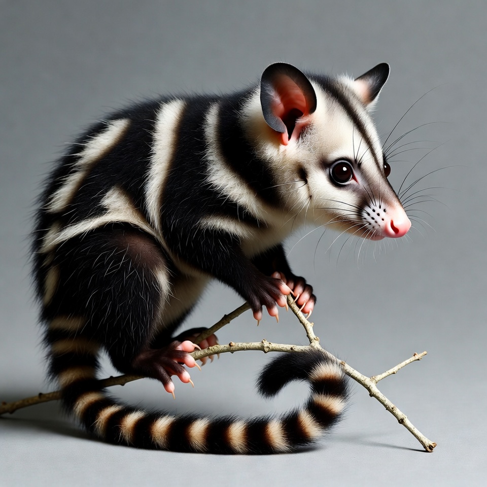 A cute striped possum with black and white fur clings to a thin branch. It has large round eyes, pink nose, and striped tail. The animal is posed dynamically against a plain gray background.