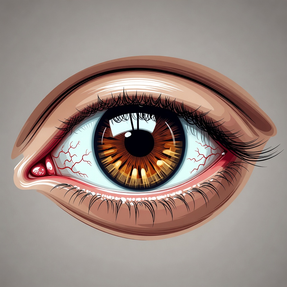 A close-up digital illustration of a realistic human eye with a striking brown iris. The eye features prominent eyelashes, visible blood vessels in the sclera, and a subtle reflection in the cornea. It is set against a plain gray background.