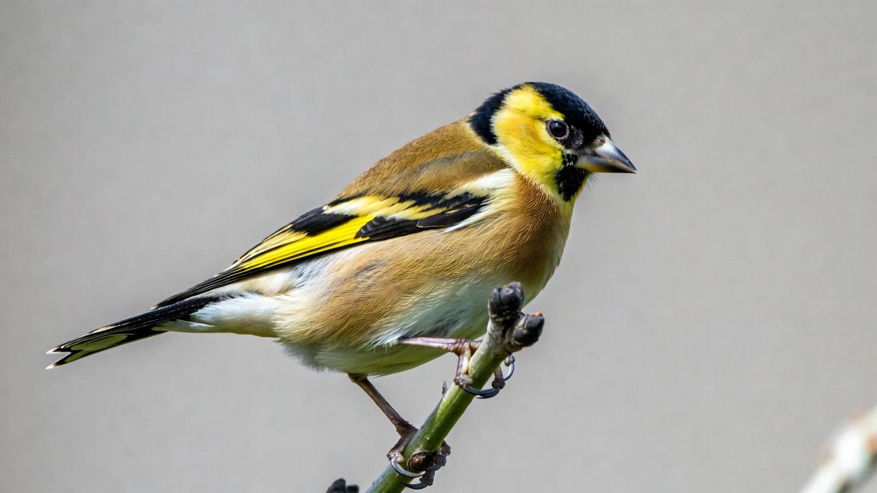 A European goldfinch with vibrant yellow, black, and white plumage perches on a thin branch. Its wings show bold yellow markings, and it faces slightly to the side against a plain gray background. The bird's beak is small and pointed, with feathers fluffed around its body.