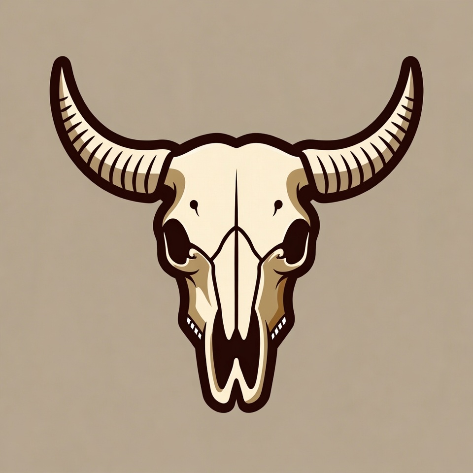 A detailed vector illustration of a longhorn cattle skull with large curved horns. The skull features prominent eye sockets, nasal cavity, and teeth, outlined in thick black lines on a beige background. The design has a flat, cartoonish style with tan and brown shading.